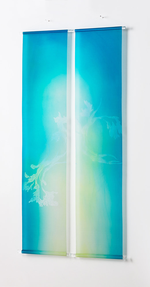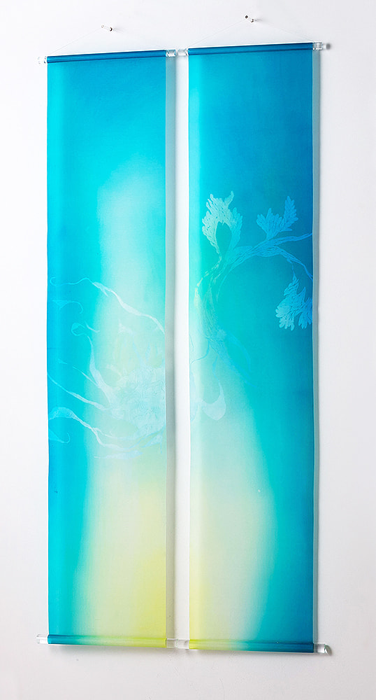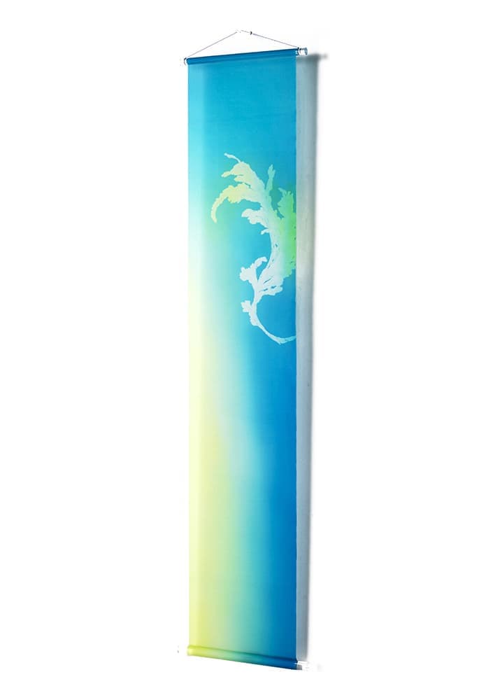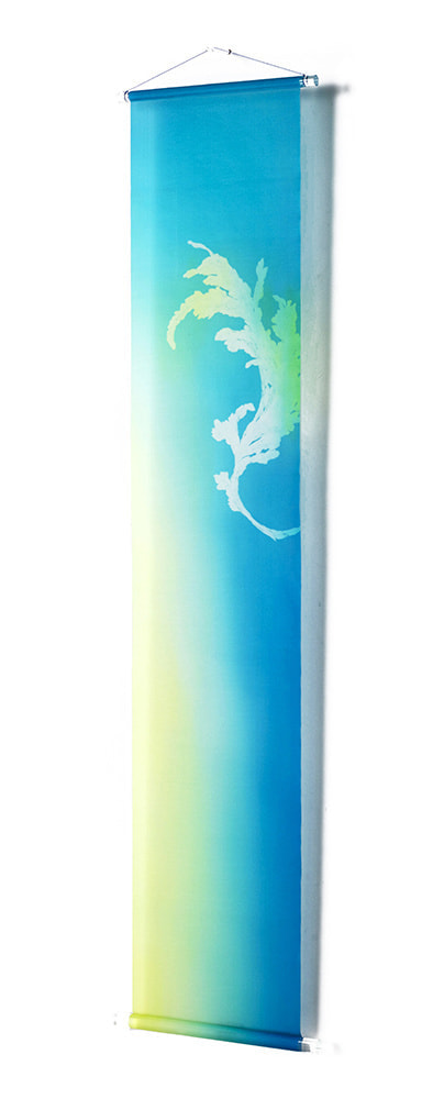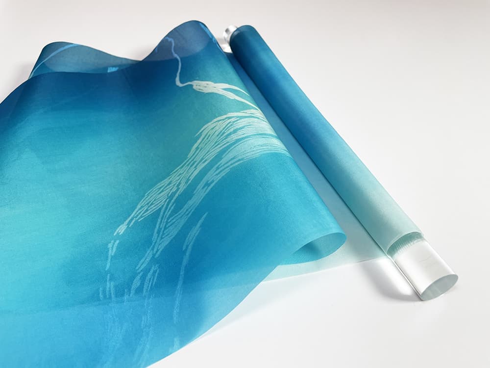 清流、爽やかな空、生命の源の海をイメージした青色は、空間に清らかな雰囲気を醸し出し、心を落ち着かせ、見る者の集中力を高めてくれるでしょう。 京友禅の技法を用い、繊細に創作された型の使用によって生まれた高級感があります。 2本ペアで創り出す空間の迫力により、色彩イメージや作品の世界観が広がるでしょう。