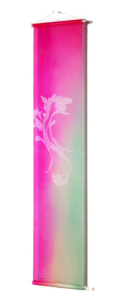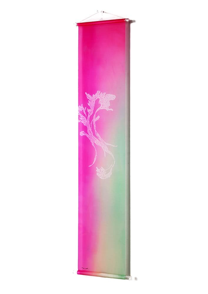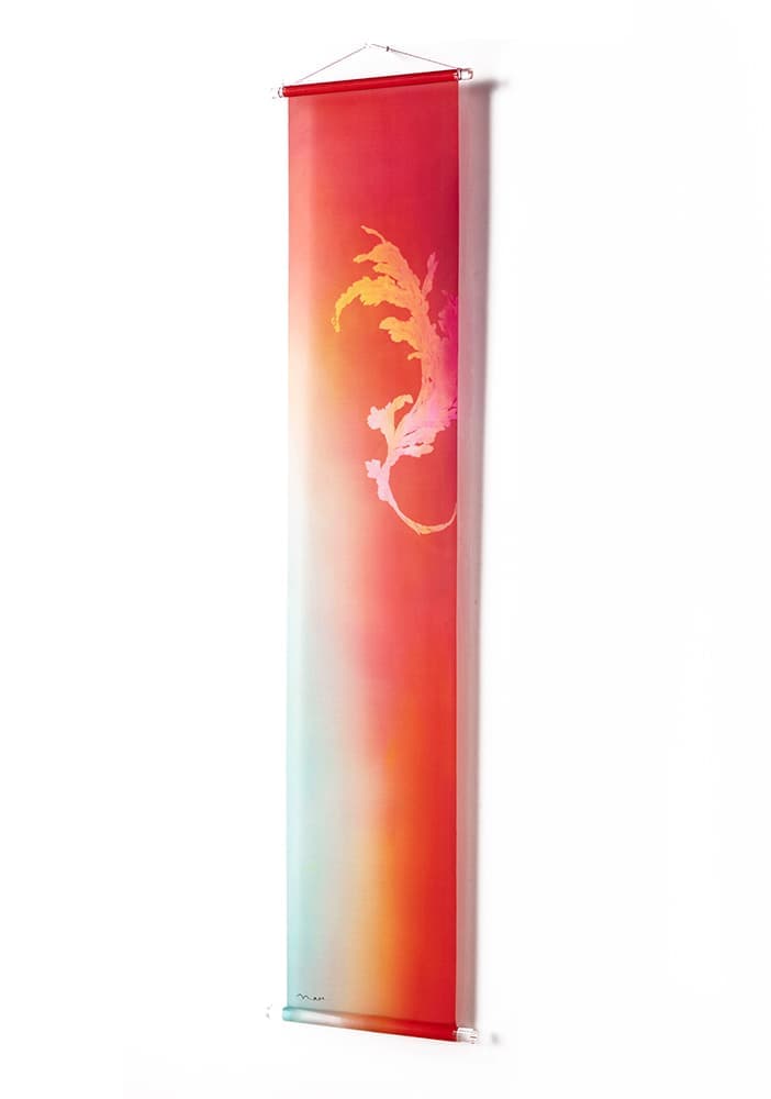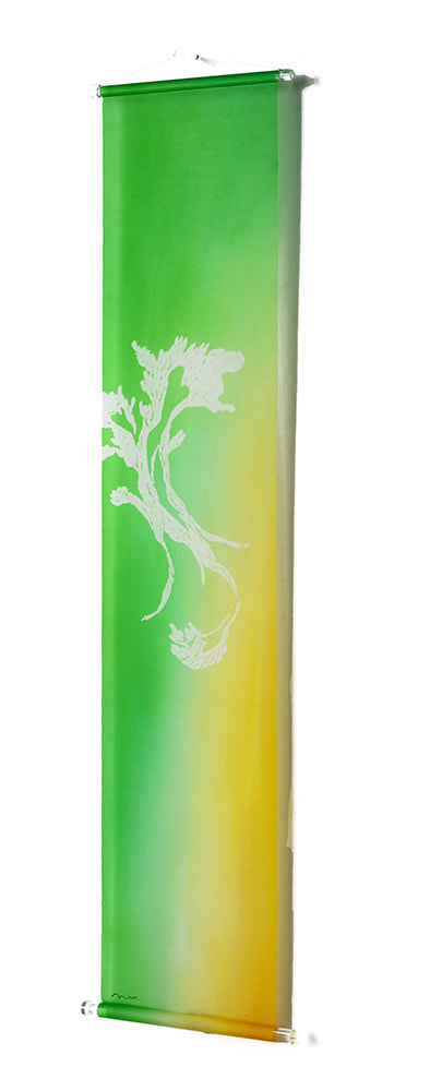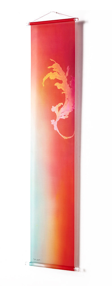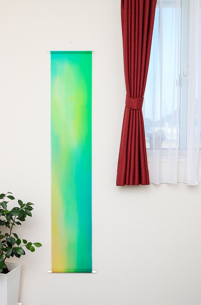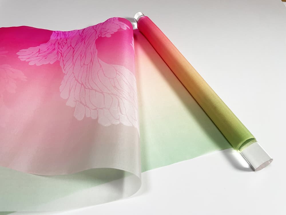 美濃友禅作家の河村尚江さんとのコラボレーション作品です。緻密で染まりやすい絵絹と鮮やかで深みのある色で染められた「美濃友禅」との掛け合わせで、新たな文化が誕生しました。斬新で優雅なタペストリーで新たな世界観が表現されています。床の間のみならず、空間に優雅さと気品を醸し出す、斬新な和風タペストリーです。どんな空間にも合うように、上下に無色透明のアクリル棒を使用しています。左右ほつれ防止特殊加工も施しております。