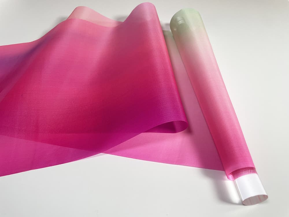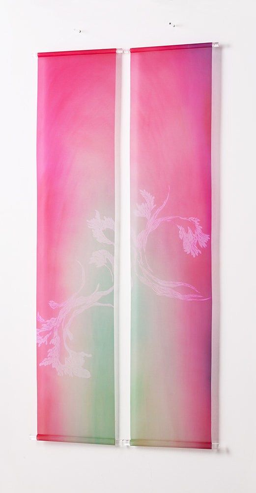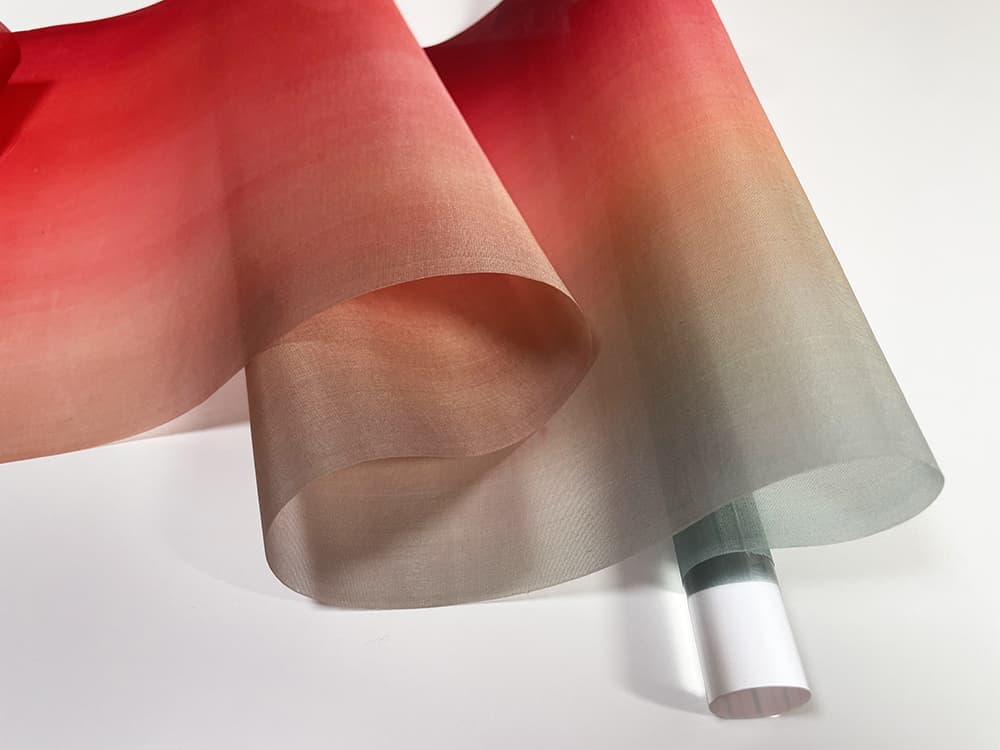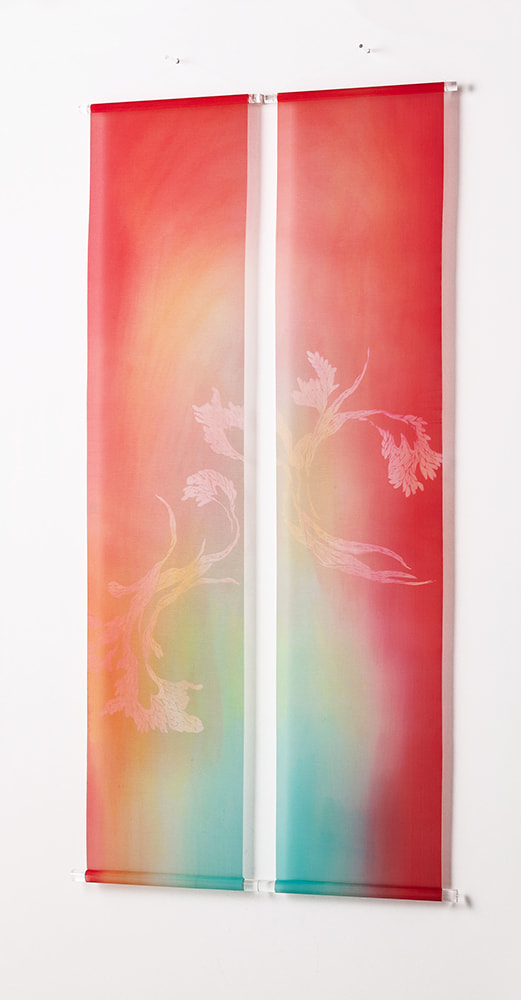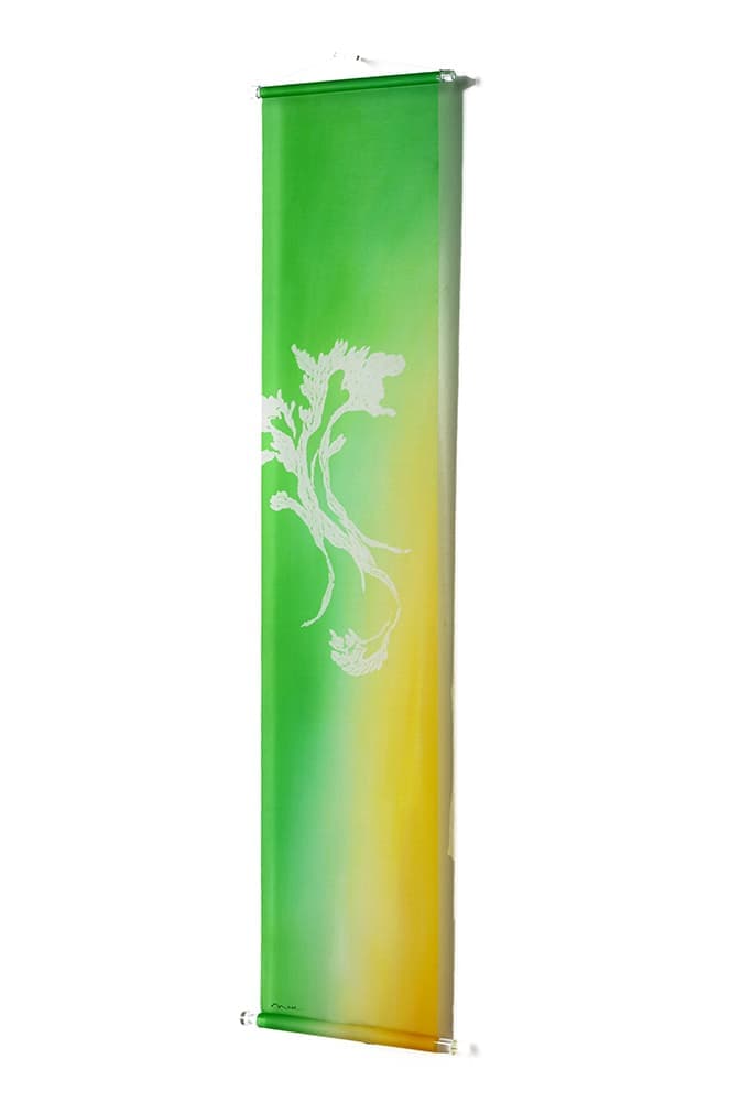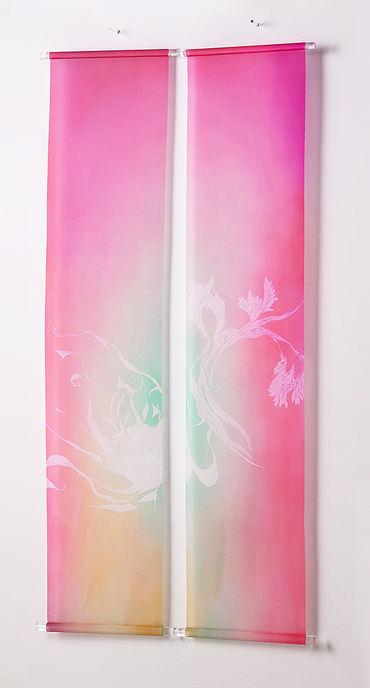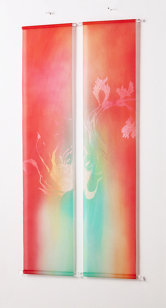 古くより日本絵画に使われてきた絵絹を現代の染色技術で染め上げ、斬新で優雅なタペストリーとなって生まれました。