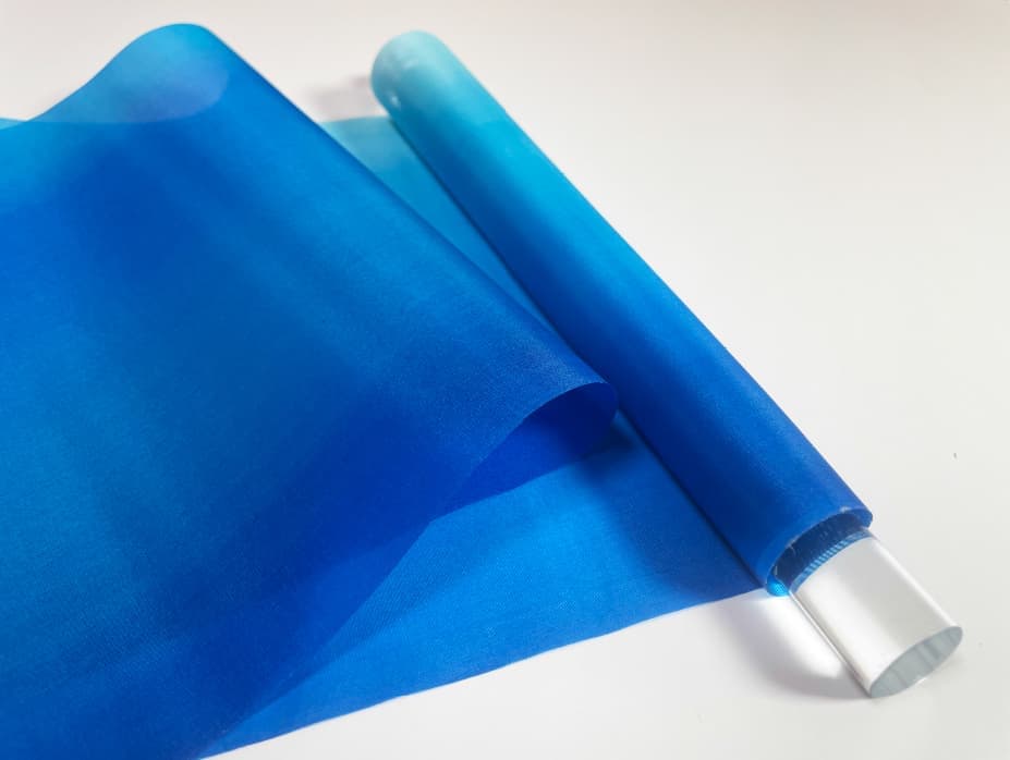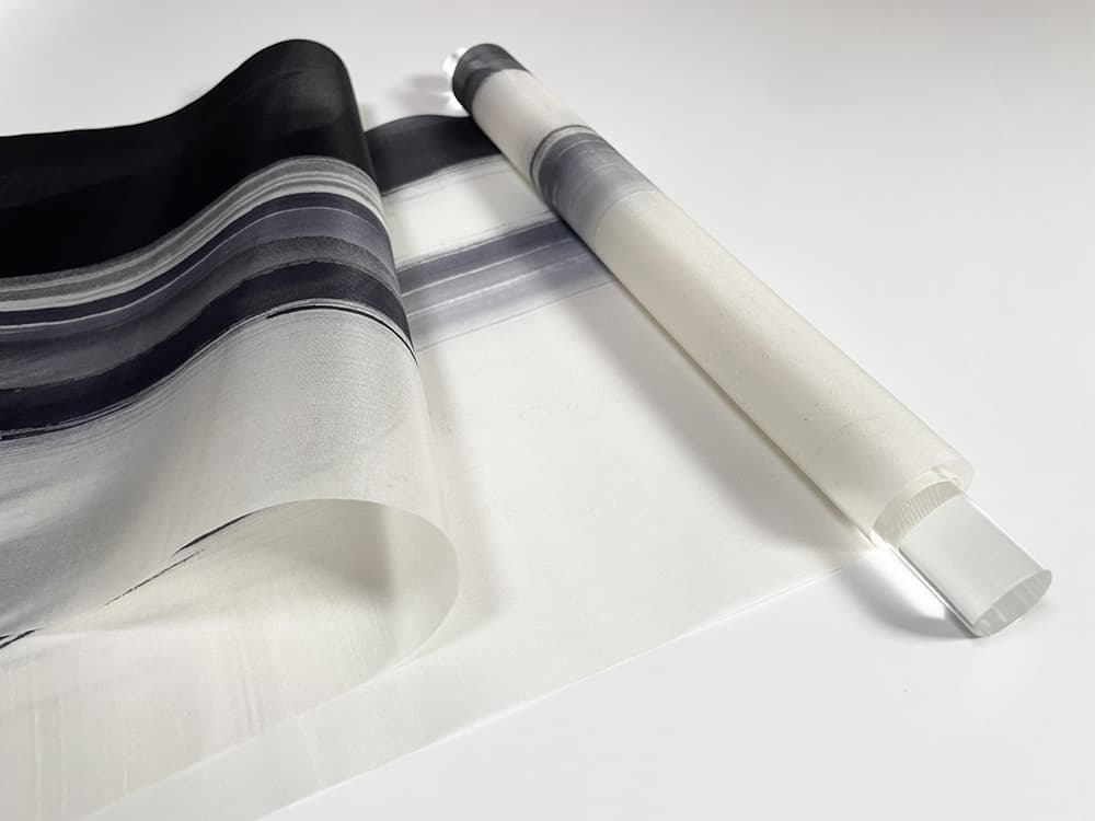 ムラなく、均一で、絵の具が芯まで染み渡るように糸加工を施し、生糸の乾けば縮み水分を与えれば伸びるという特性を残したまま織り上げてあります。