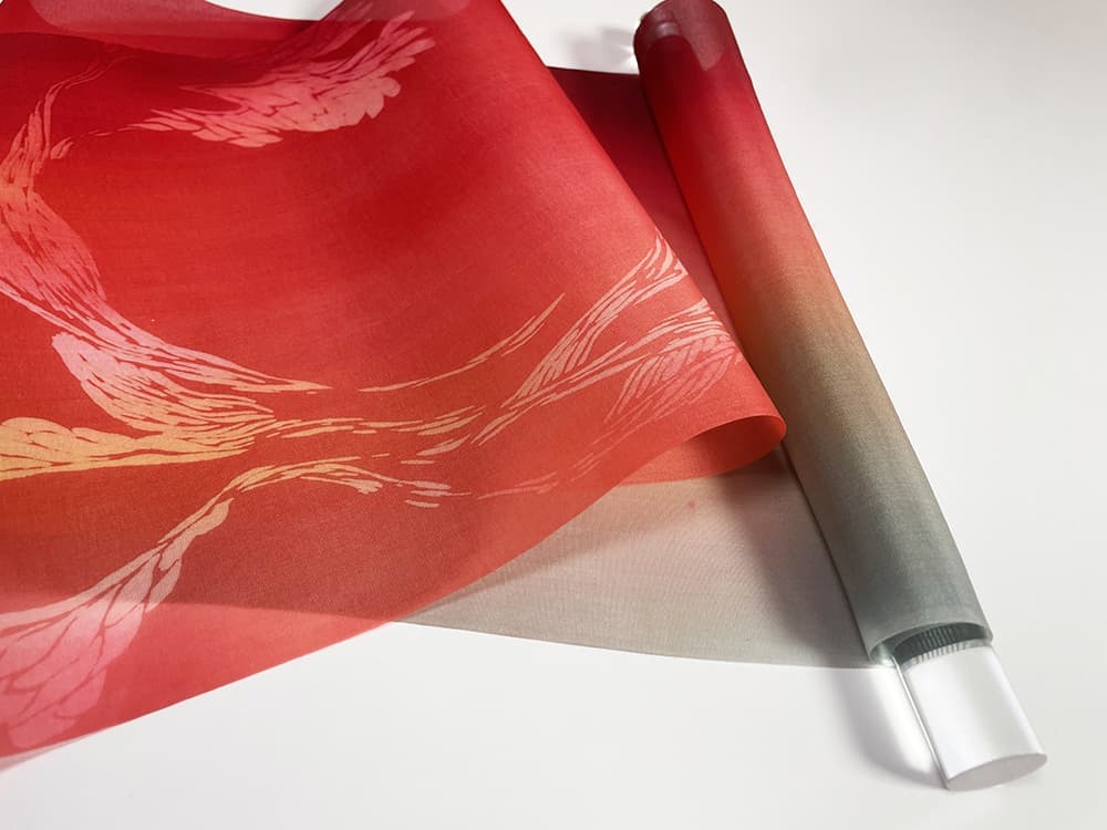 宇宙、太陽、情熱をイメージした赤色は、空間に陽光が降りそそぎ、温かく優しい気持ちにし、モチベーションを高め、前向きな気持ちにさせてくれるでしょう。 京友禅の技法を用い、繊細に創作された型の使用によって生まれた高級感があります。 2本ペアで創り出す空間の迫力により、色彩イメージや作品の世界観が広がるでしょう。